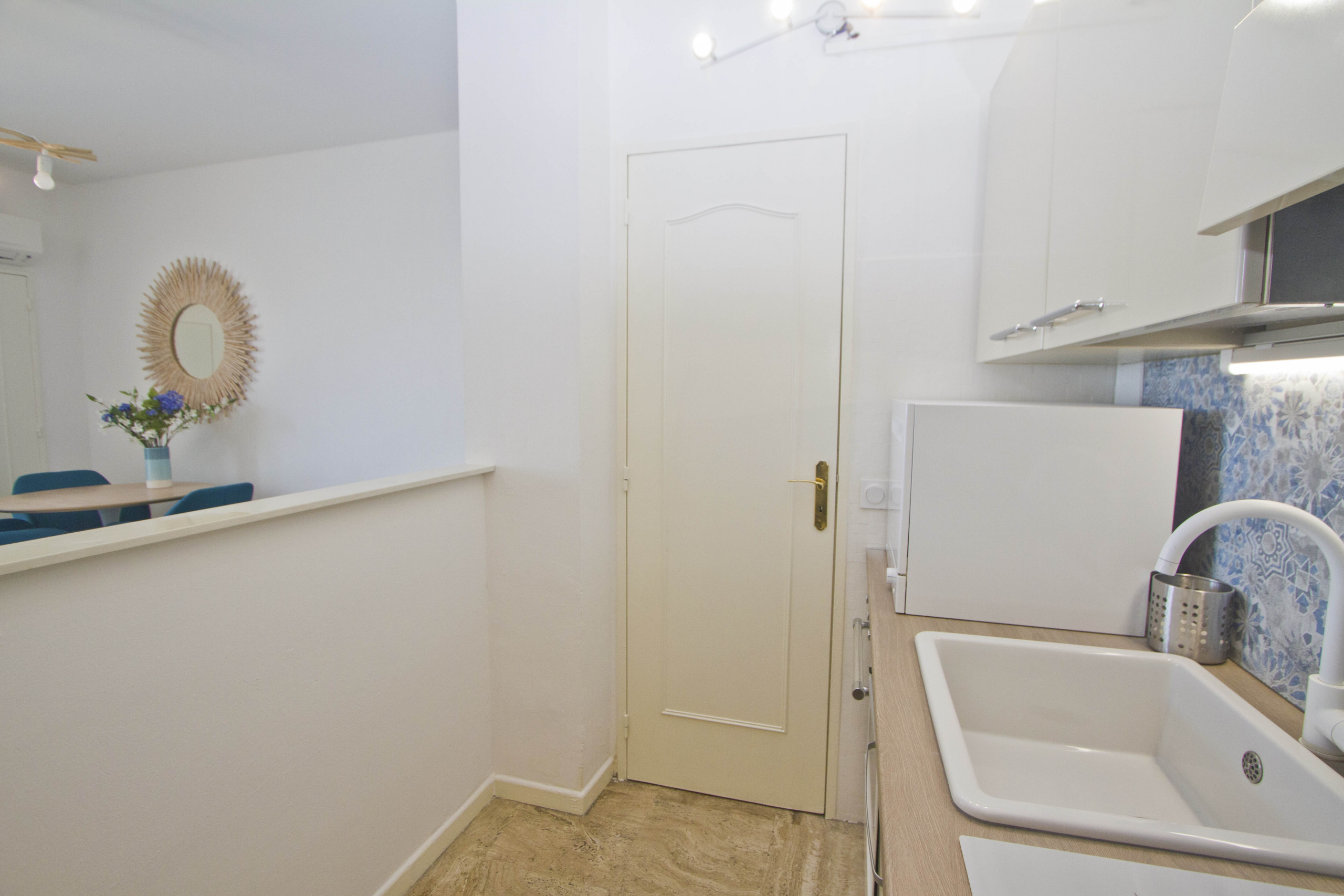 La cuisine américaine et très bien équipée en ustensiles ainsi qu’en appareils électriques comme (plaque induction, lave-vaisselle, four électrique, machine à café, bouilloire, sèche-cheveux, etc…).